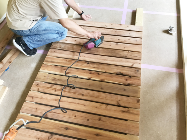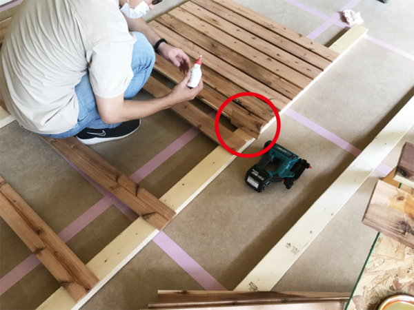 固定の際に板の間に木材を挟んでとめていくと同じ間隔で簡単に施工できます!